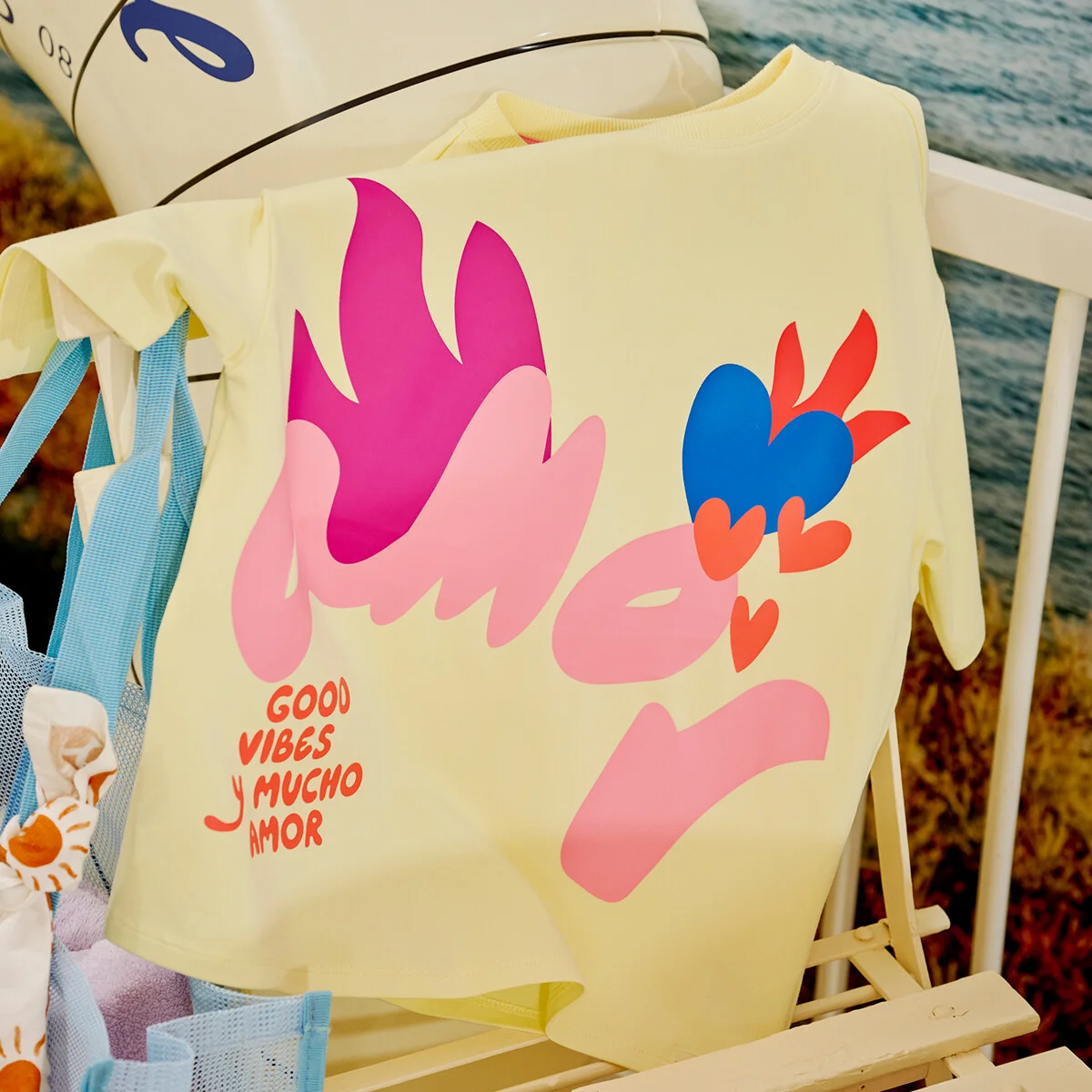 Oversized tee met Good Vibes y Mucho Amor! Relaxte fit en een look die meteen energie geeft. Stoer met denim of juist knallend met een kleurrijk item.