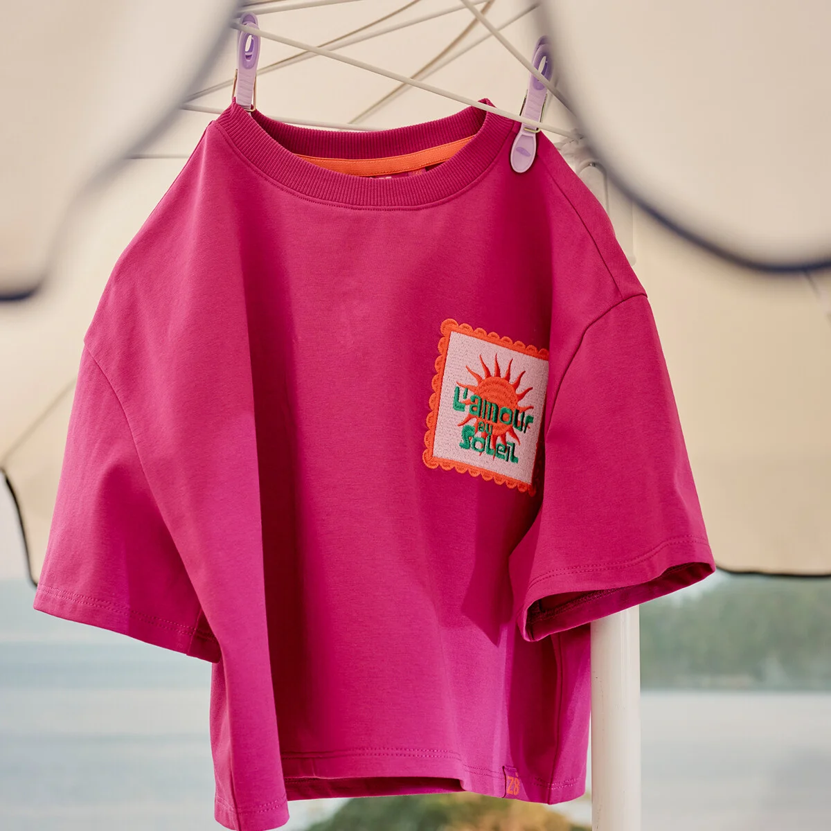 Cropped tee in foxy violet met een krachtige, frisse look! De lengte sluit mooi aan op de tailleband voor een stoer look! Perfect te stylen met een van onze wide leg pants of een van je andere summer favorites.