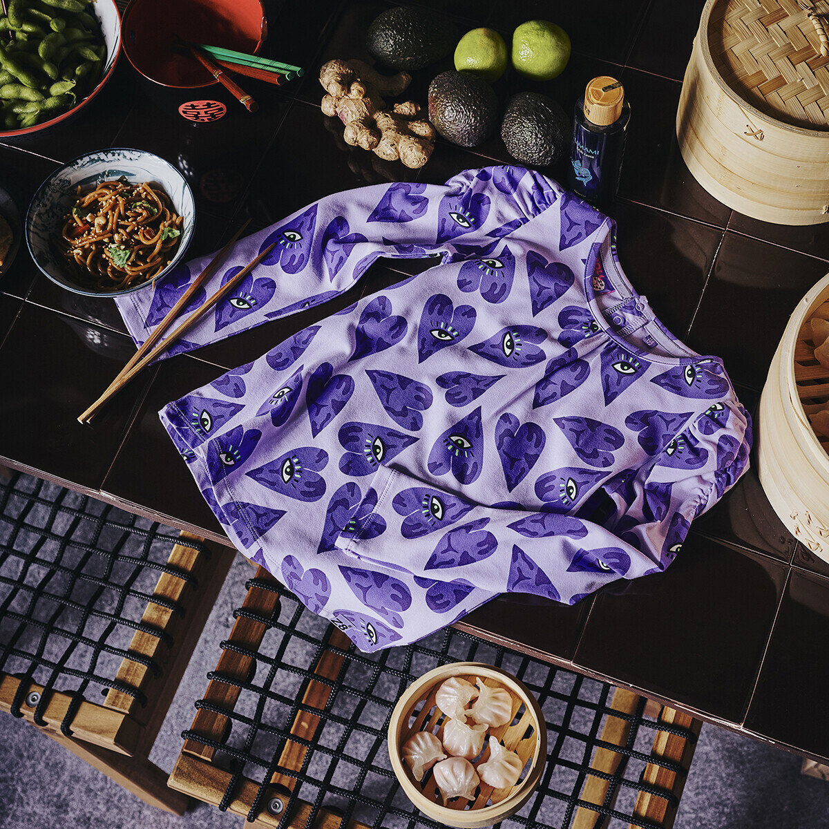 Eye love it! Een aansluitende longsleeve met statement print en schattige pofmouwtjes.