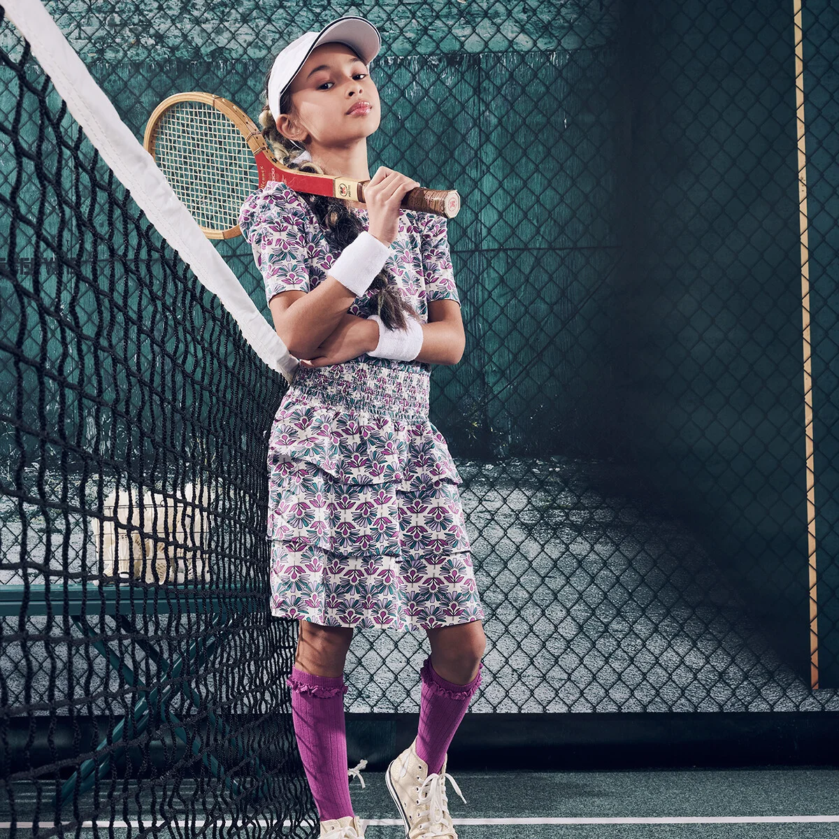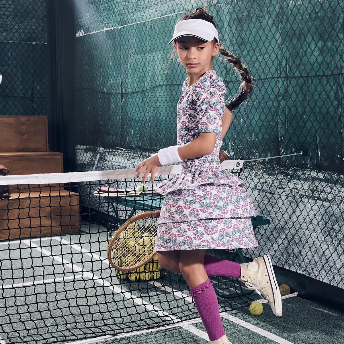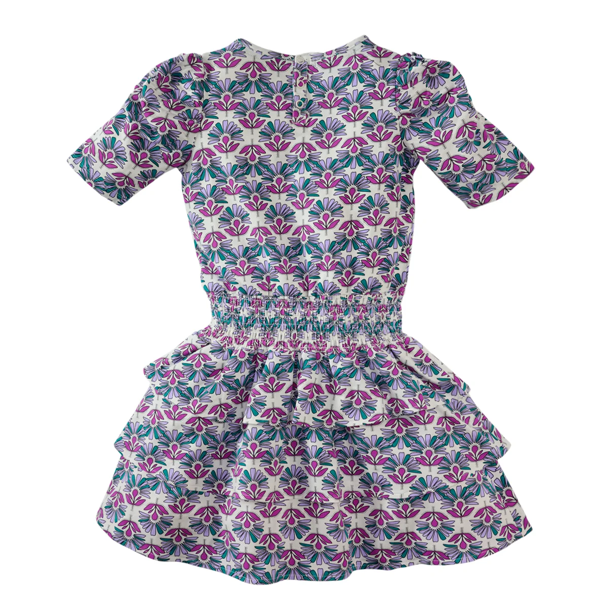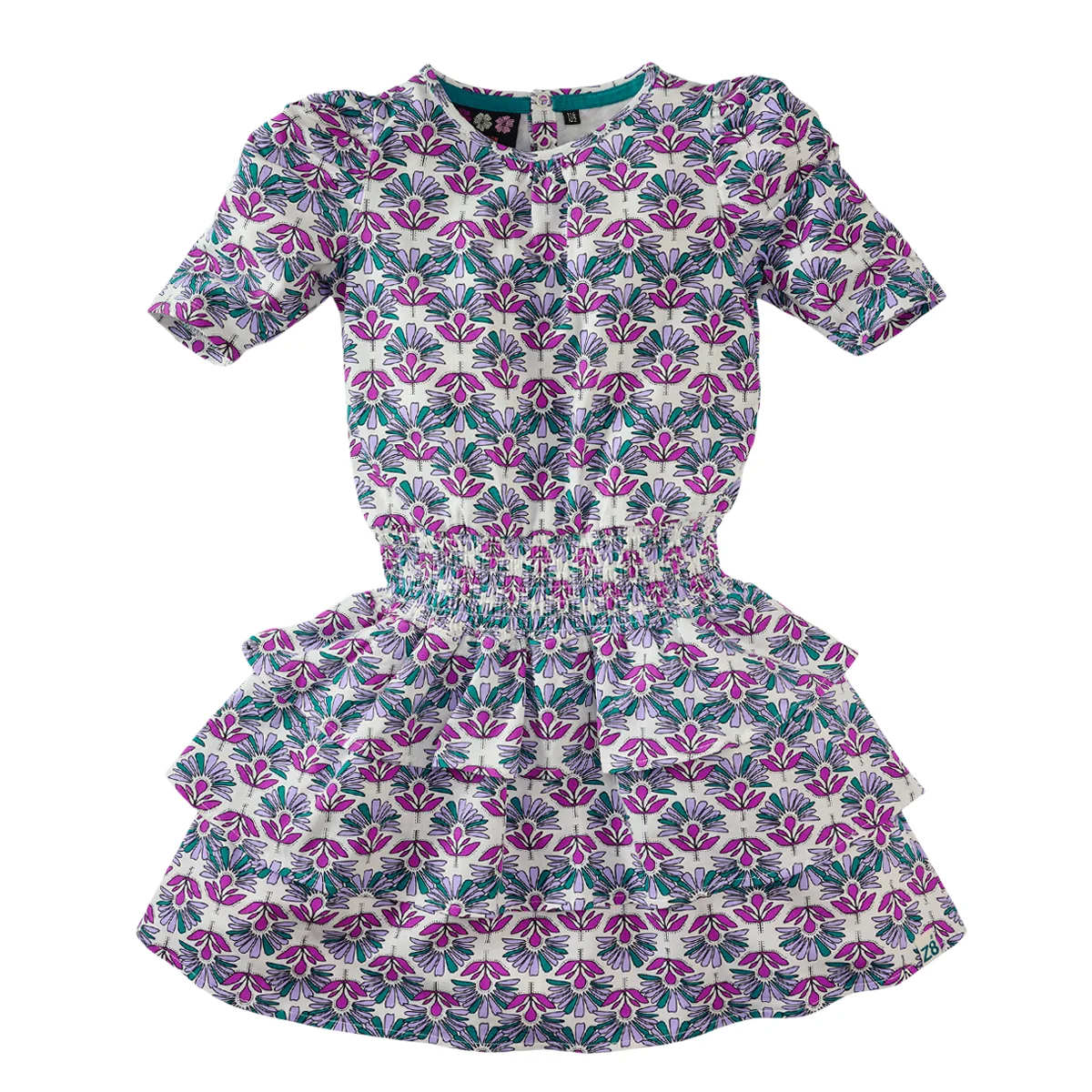 Ladylike! Jana is een prachtige girly dress met ruffle layers, smocked waistband, pofmouwen, alles waar elk meisje blij van wordt! Jana heeft een mooie bloemen all-over print in de kleuren Loads of Lavender, Vigorous Violet, Mellow Moon & Biskay Bay! Kniekousen Clary staan er perfect bij. Wát een summercocktail!