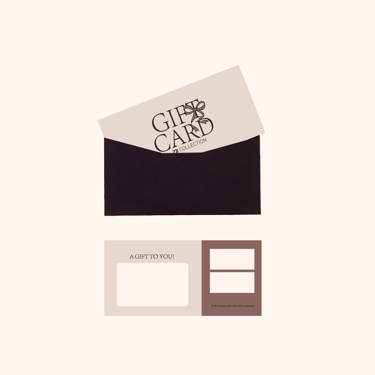 Op zoek naar een leuk kadootje, maar kan je niet kiezen? No problem, we've got you covered! Kies voor onze unisex giftcard. Kies zelf het bedrag en vul een persoonlijke boodschap in, deze wordt mooi meegedrukt op de bon. De kadobon wordt opgestuurd in een stijlvolle envelop met sticker.