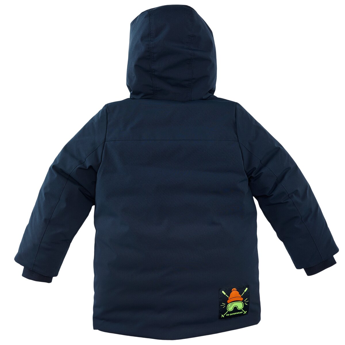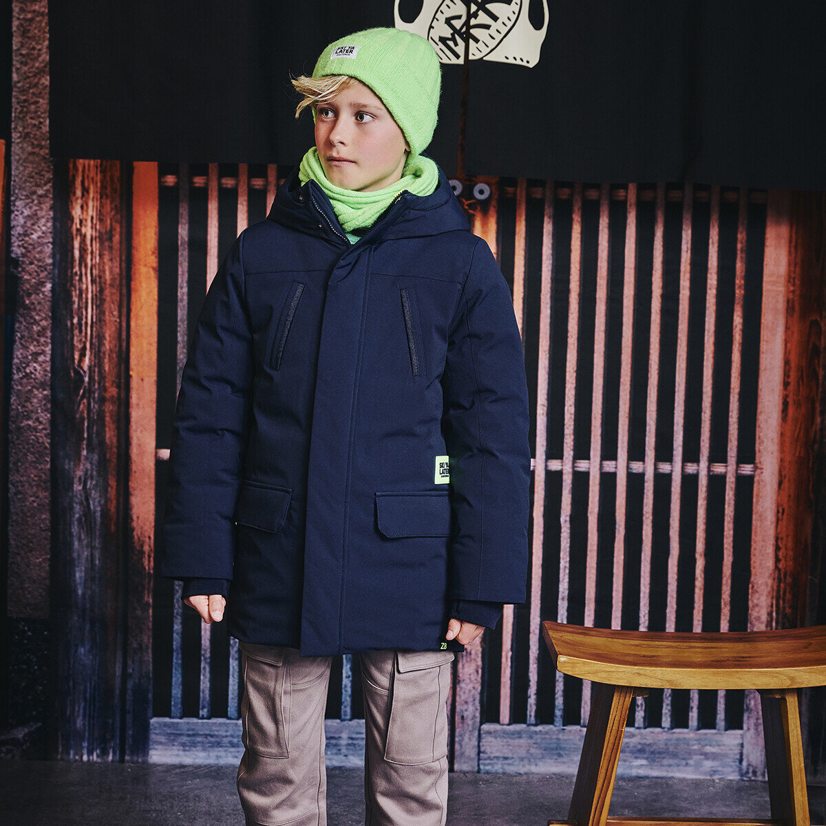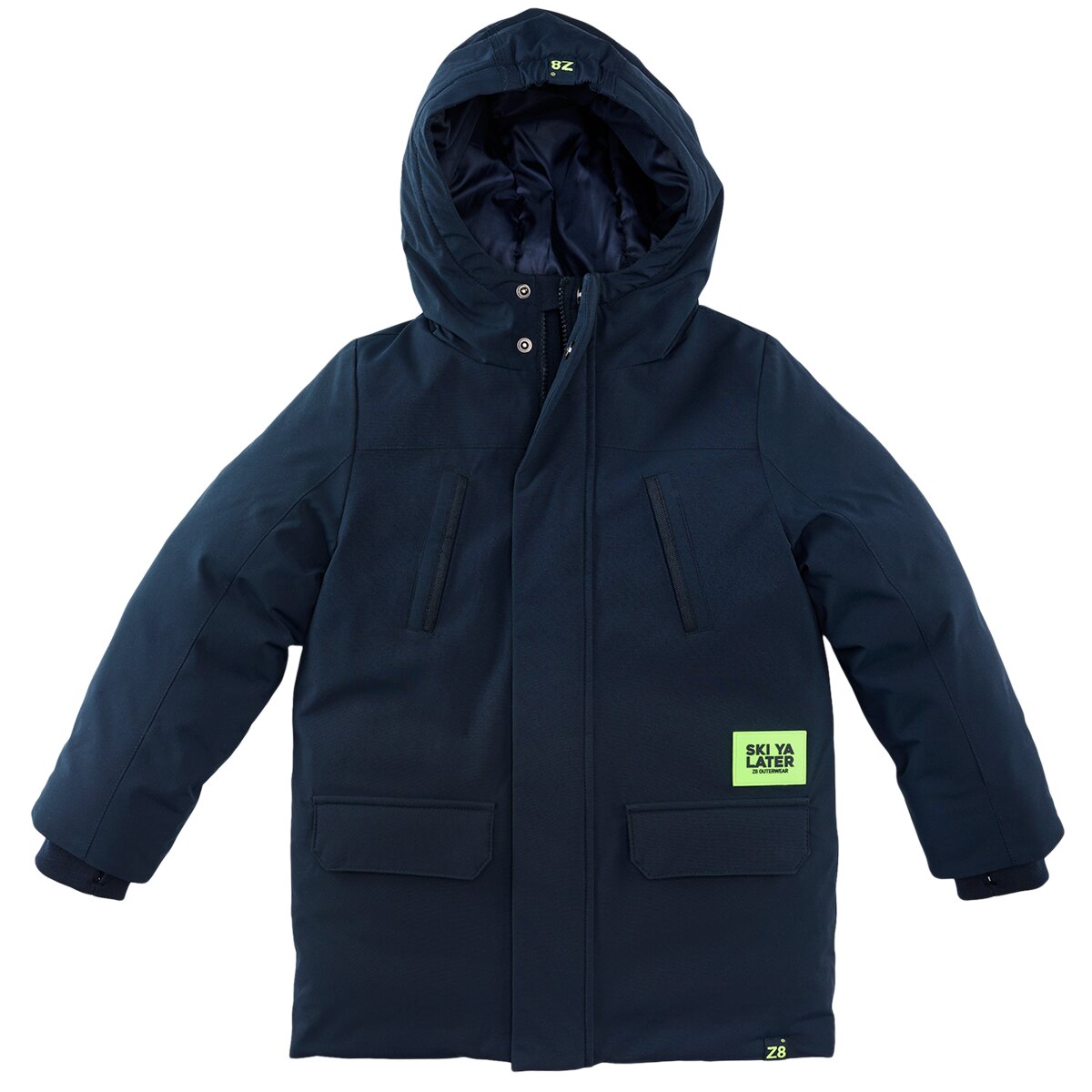 Ski Ya Later! Deze diepblauwe winterjas houdt je warm op koude dagen, met zachte cuffs en een stoere neon patch als finishing touch.