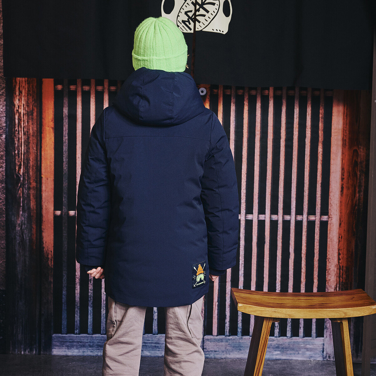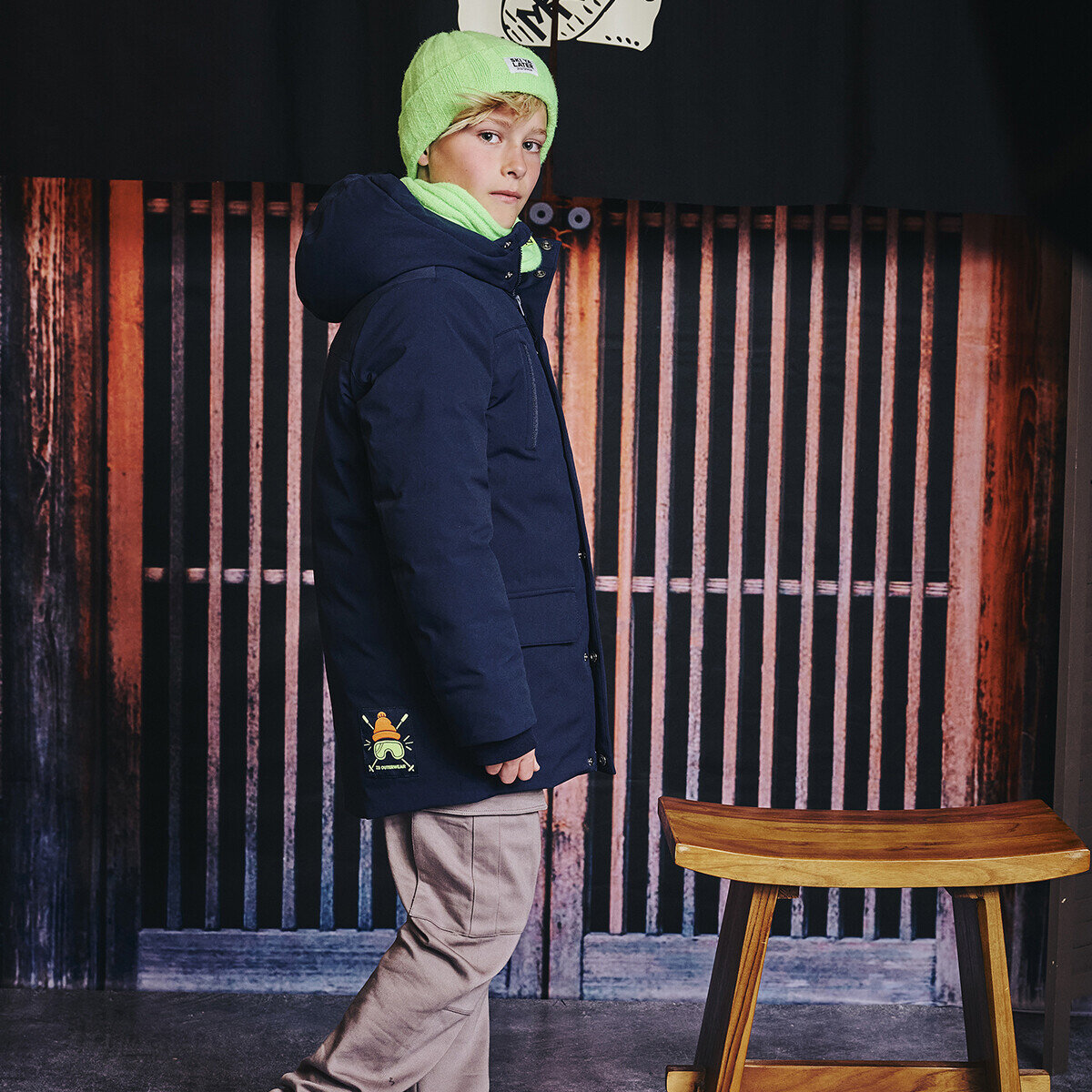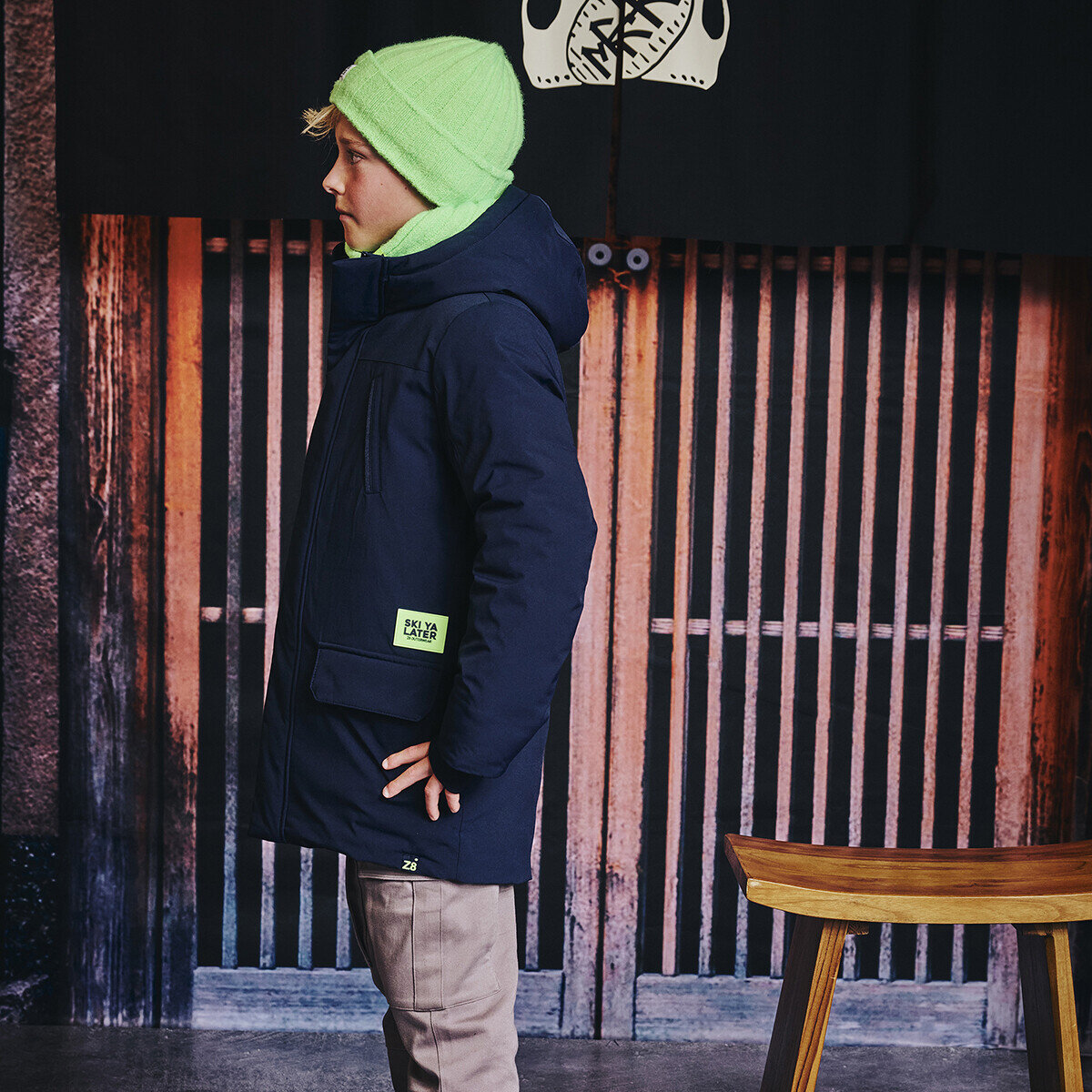 Ski Ya Later! Deze diepblauwe winterjas houdt je warm op koude dagen, met zachte cuffs en een stoere neon patch als finishing touch.