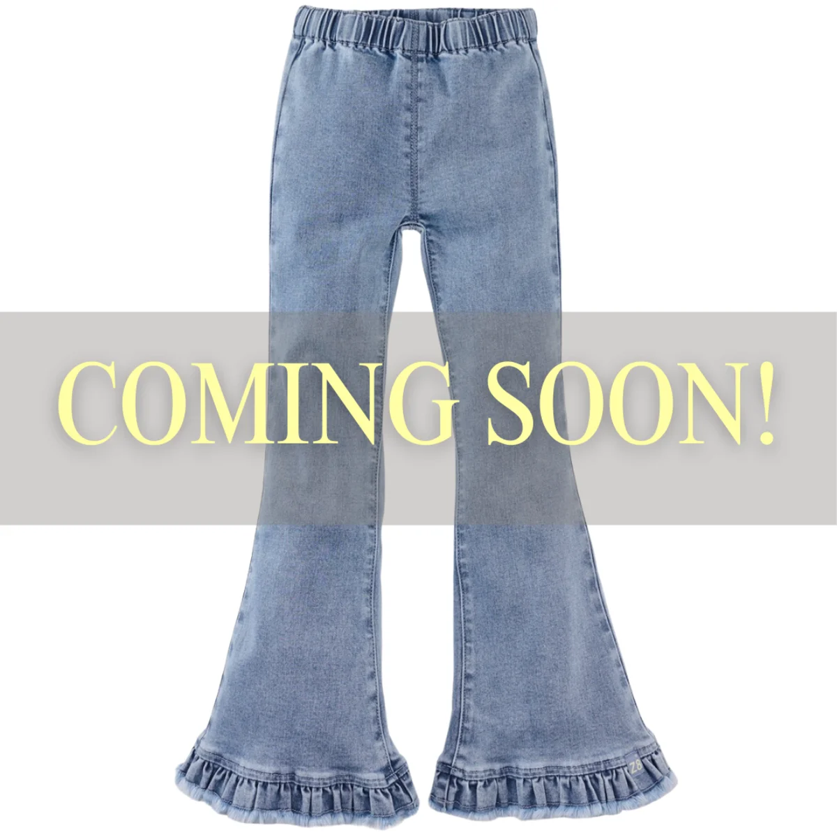Denim flared pants met stretch en een ruffle finish voor extra flair. Stoer én girly! Dankzij het verstelbaar elastiek in de waist maak je hem perfect passend. Draag ’m als co-ord met gilet Cateleyа of mix ’m met je favoriete top.