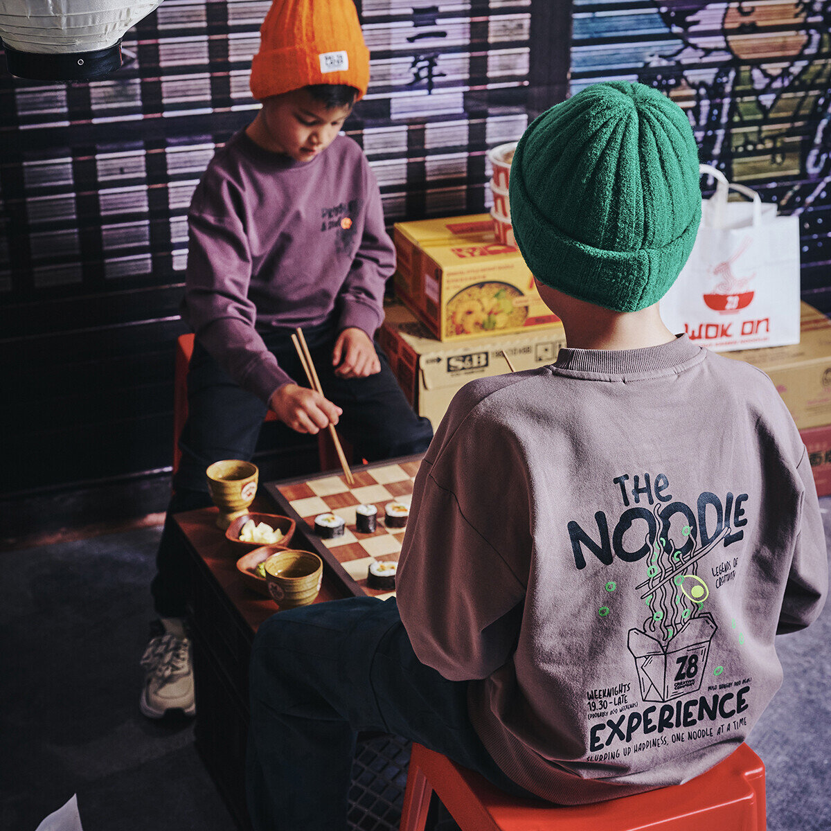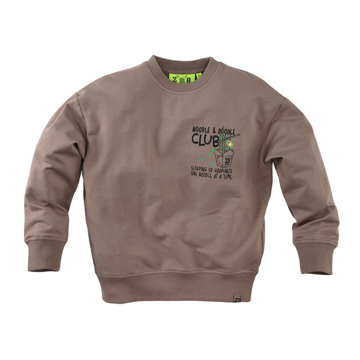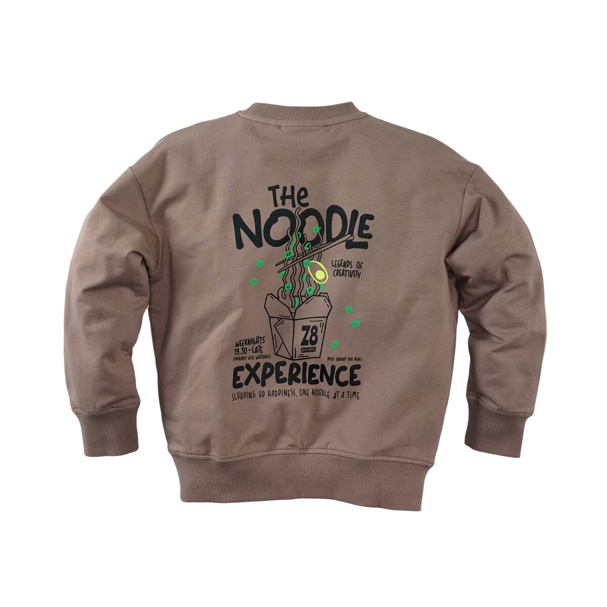 One noodle at a time! Oversized sweater in twilight taupe met een noodle‑backprint.