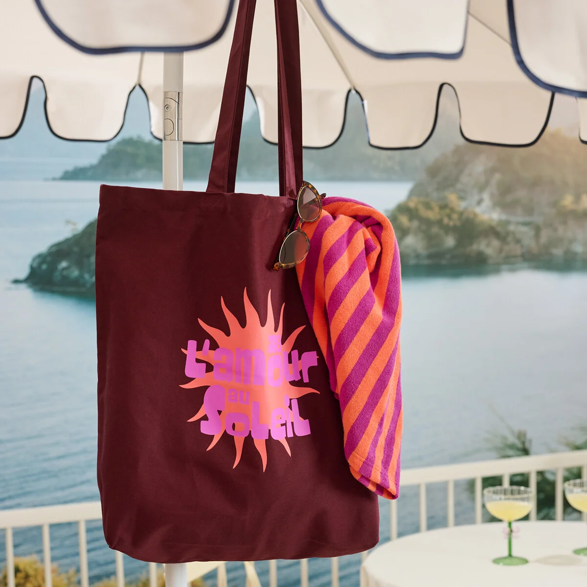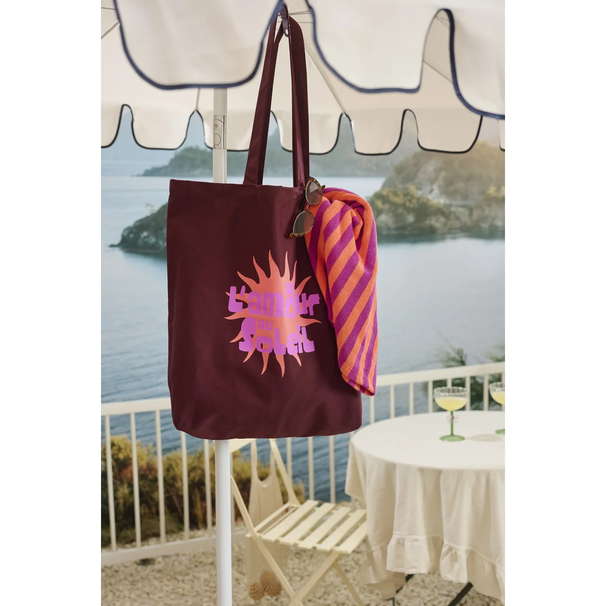 L’amour au Soleil. Ruime shopper met stevige hengsels en een katoenen, stevige kwaliteit. Perfect voor school, strand of een dagje stad – alles past erin. Voeg 'm gratis toe aan je bestelling bij besteding van €75,00.