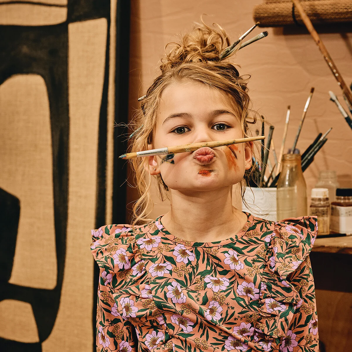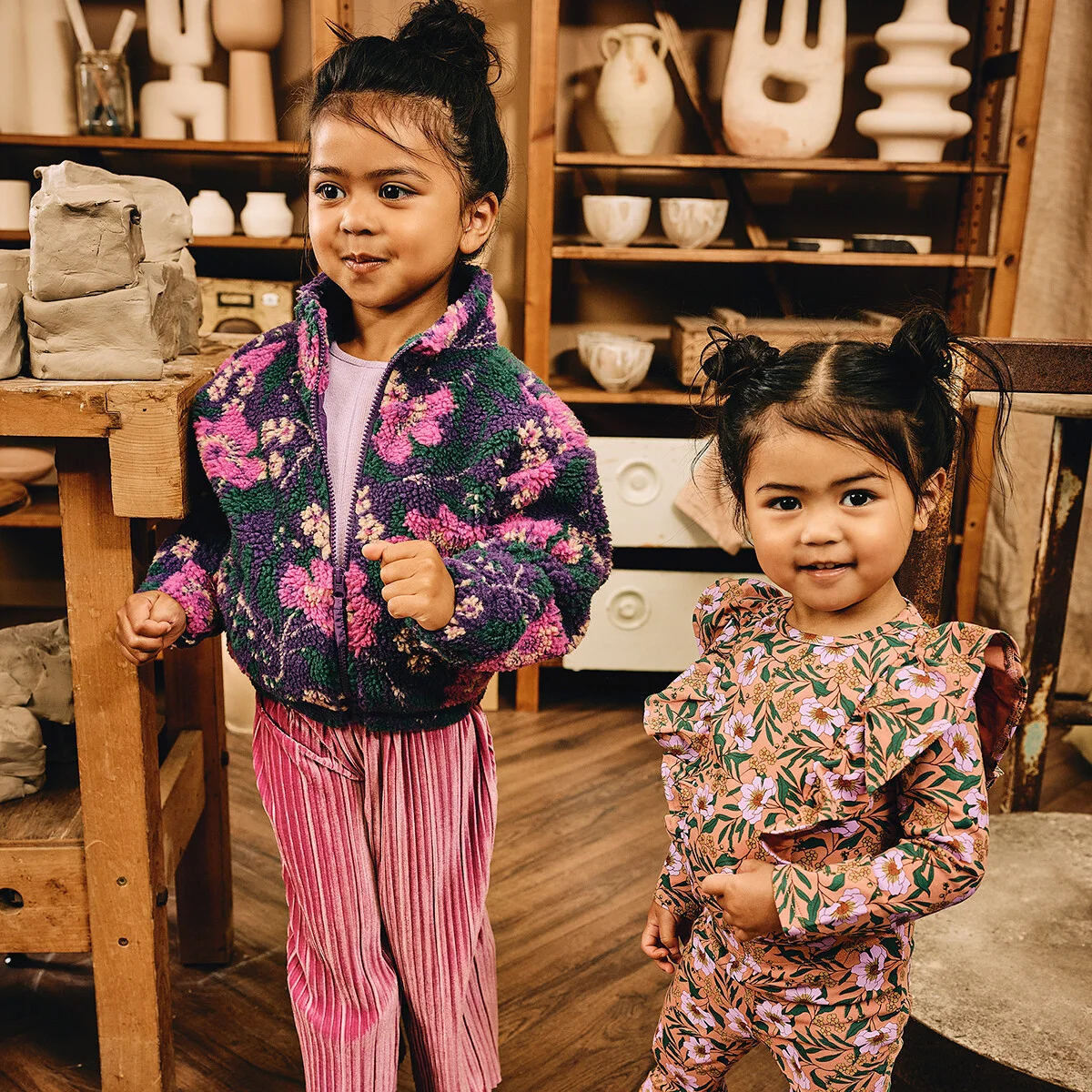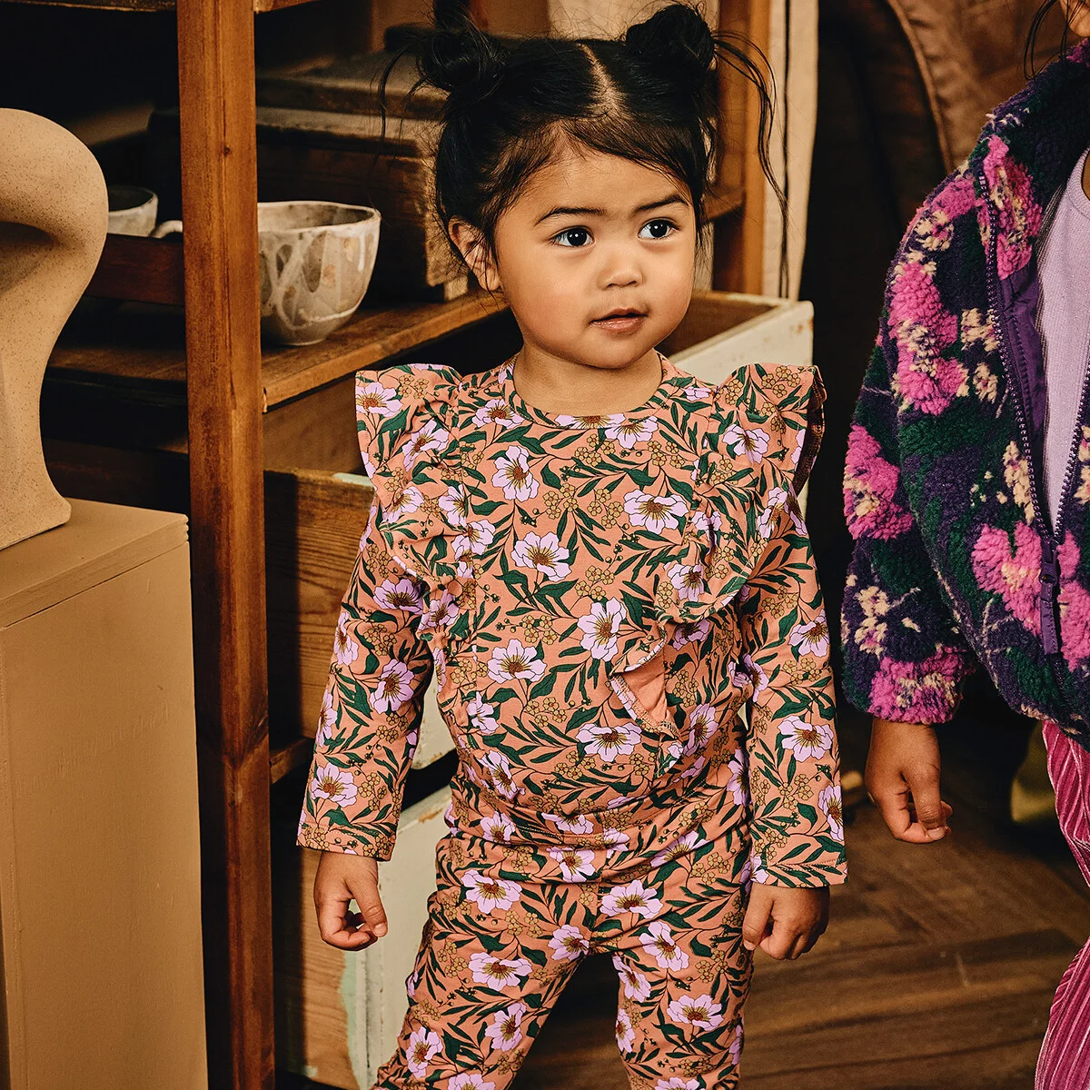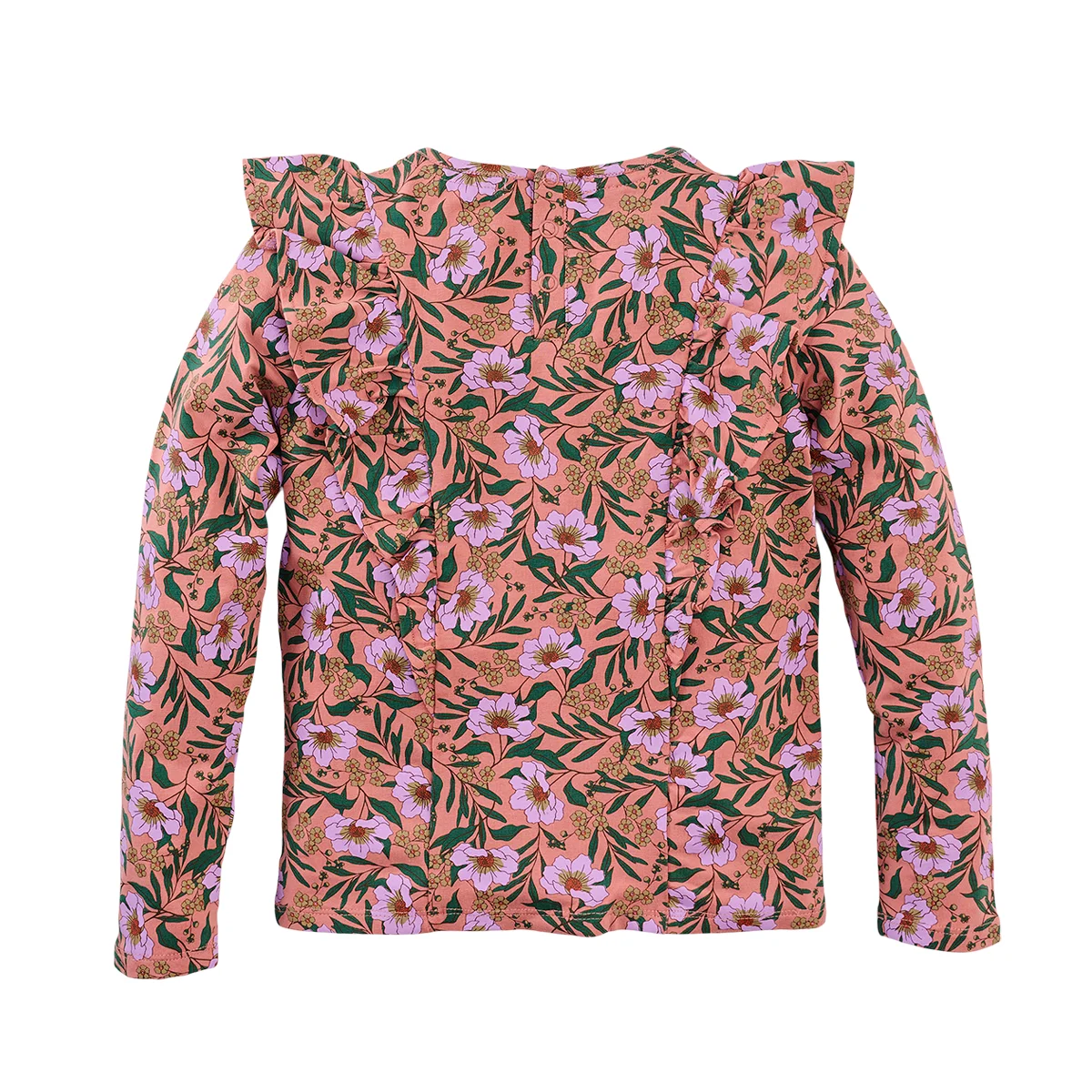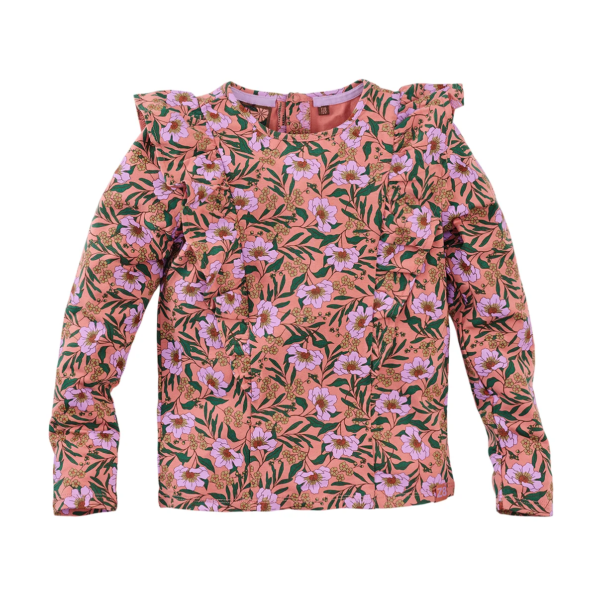 Cosmea flowers in the house! Longsleeve Yelina maakt van je knapperd een artistieke muse! Check out de details van de bloemenprint, deze zijn zelfs helemaal verweven in de ruffles! Lekker chic is ze door de ruffles, maar ook zacht door de katoenen stof. Maak je outfit helemaal af met flared pants Izara. Head-to-toes in flowers!